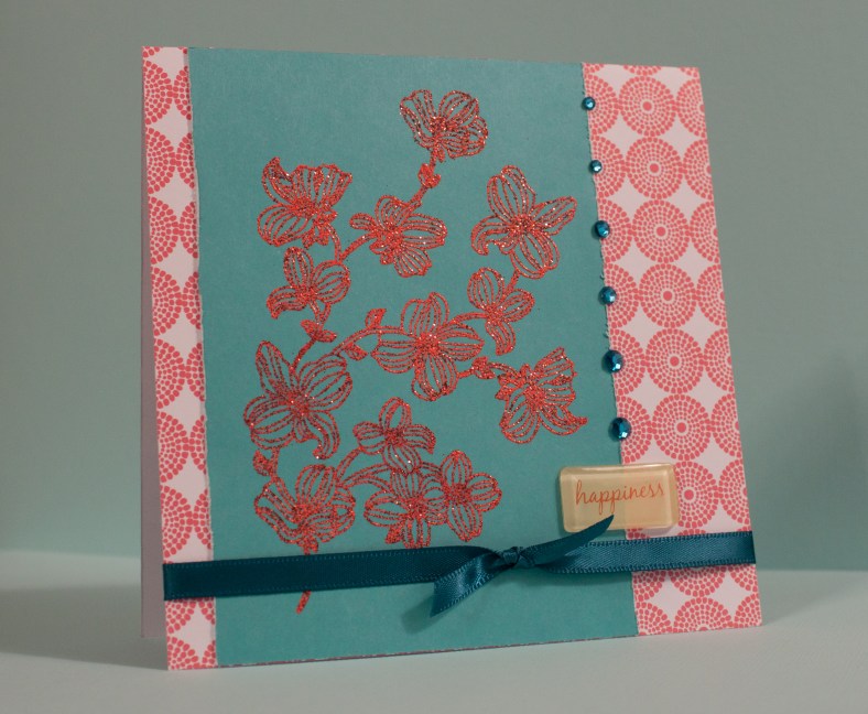 The card below is bold thanks to the bright pop of glittery orange from the embossing powder. I love embossing. It can get messy, with powder getting everywhere (much like glitter does), but the effect is eye-catching.
