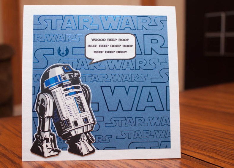 White textured cardstock, “Star Wars” foiled cardstock, chipboard R2-D2 (outlined in white pen)