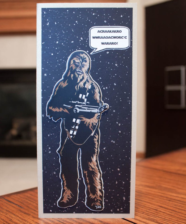 Gold metallic cardstock, silver-flecked black cardstock, chipboard Chewbacca (outlined in white pen), white textured cardstock for “talk bubble” (also outlined in white pen)
