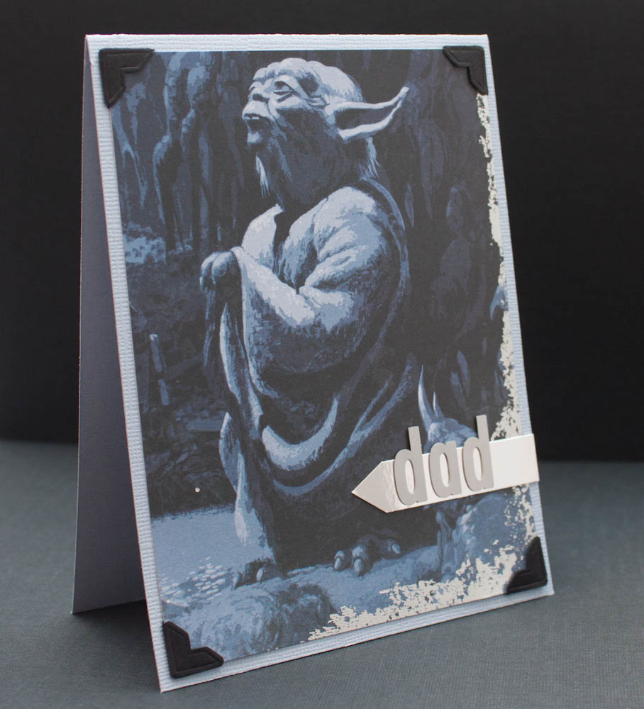For the second card, I cut the printed cardstock from a 12-by-12-inch piece that features a Yoda scene with foiled edges. I added black photo corners, a tab cut from the shiny silver cardstock and metal letters. The card is made of light-blue cardstock.