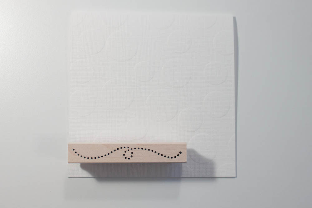 Make a card from a 5-by-10-inch piece of polka-dot embossed, white textured cardstock (such as from Bazzill Basics.) Stamp a dotted-scroll image (mine’s from Impress Rubber Stamps) in black ink (I used VersaFine in onyx black) on the lower-left corners of the front and back of the card.