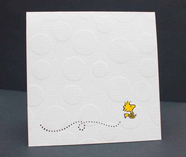 This card shows off the cardstock’s subtle pattern of embossed polka dots, which doesn’t overwhelm little Woodstock. Add a bit of glaze pen, and you’re done.