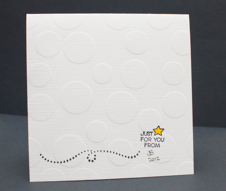 Stamp a “created by” type of image (such as “Just for you from” from the Handmade Everyday stamp block by Stampedous!) in black ink to the right of the dotted scroll on the back of the card, and accent it with yellow glaze pen.