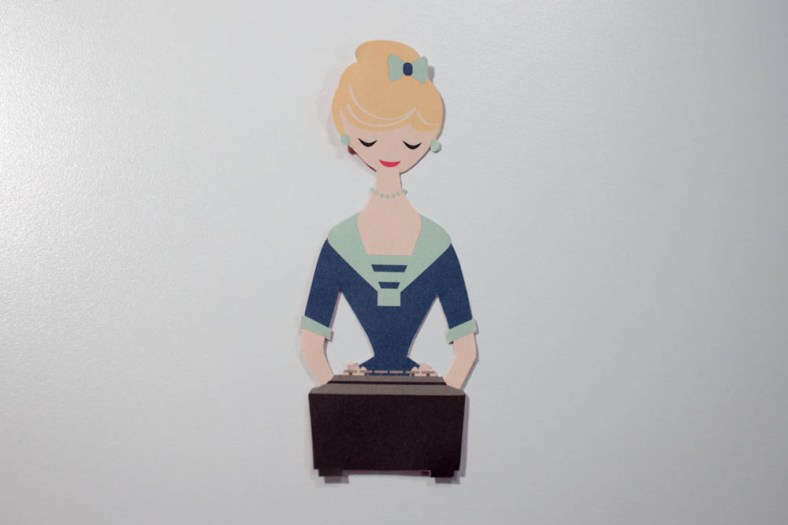 I saw the blond stenographer on the “Shorthand” patterned paper and thought, “That could pass for a large, old calculator,” and cut her out. If this would be your first hand-cutting experience, be warned: It’s time-consuming, strains your eyes and is not for the faint of heart. I’m a professional (ha!).