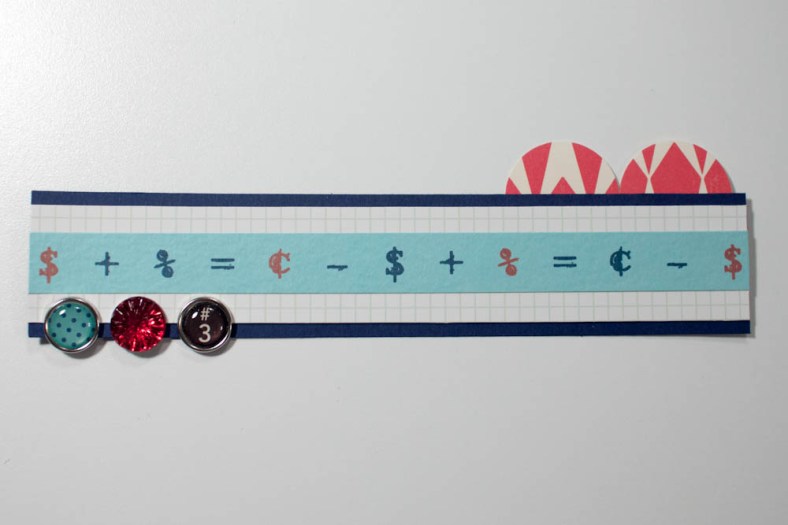 Using a computer program, type a line — slightly less than 6 1/8 inches long and slightly less than 1/2 an inch high — of dollar, cent, percentage, equal, addition and subtraction symbols in dark-blue and red typeface using a typewriter font (I used the Rough Typewriter font by JibbaJabba Fonts, which you can download here), using red for every fourth character. Print on sea-foam-green textured cardstock. Trim the paper around the symbols to make a 6 1/8-by-1/2-inch strip, and adhere, centered, on top of the grid-patterned paper.