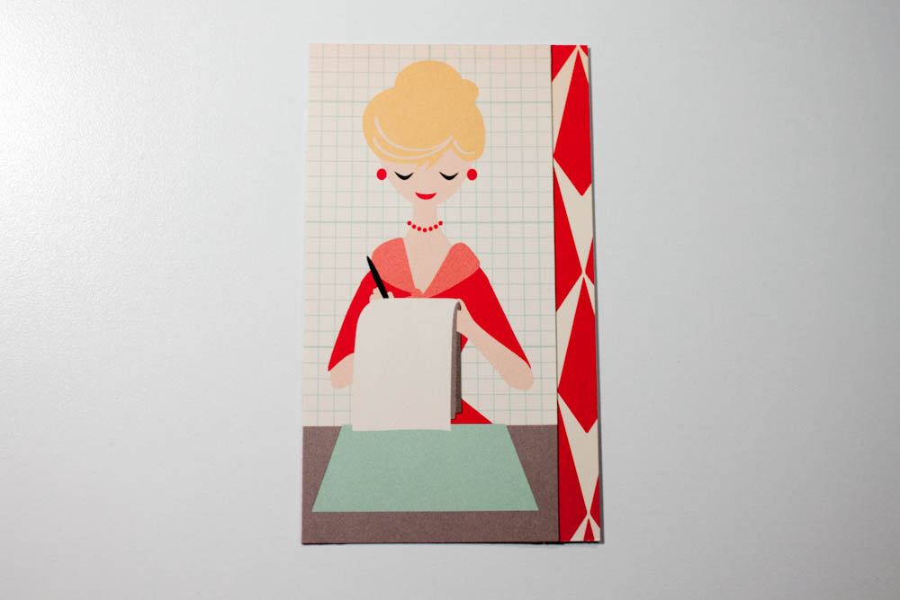 Trim a note-taking secretary from the 9 to 5 “Shorthand” cardstock. Cut a strip of red-and-cream patterned cardstock (from the reverse side of the “Shorthand” paper) that’s about 1/2 an inch wide and the same height as the secretary piece, and adhere it under the right edge of that piece so 1/4 of an inch is showing.