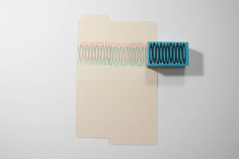 Stamp a retro border image in rose-coral and light-green inks (such as ColorBox Cat’s Eye Queue fluid chalk ink in rose coral and ColorBox Petal Point ink in mint), slightly off-centered, on a mini die-cut file folder (such as one from the “Miscellany” pack).
