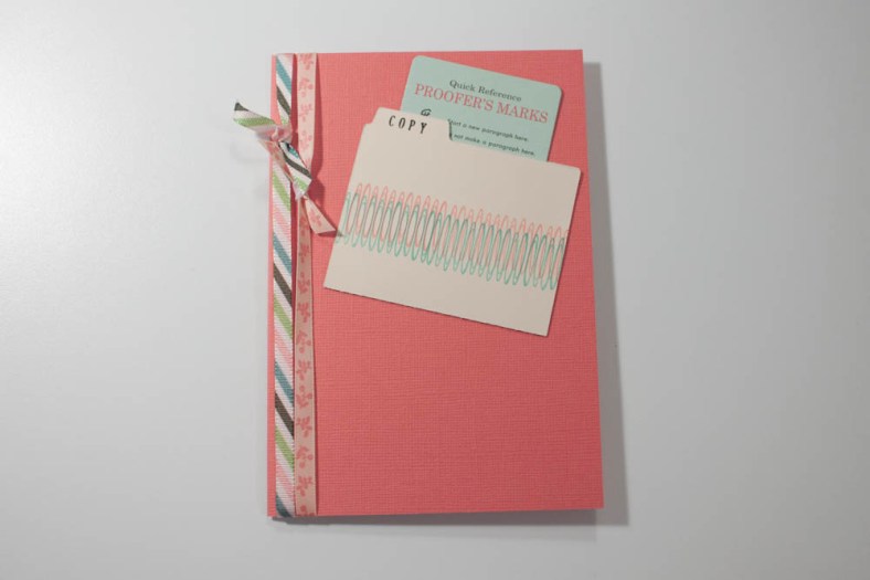 Adhere the folder’s edges together and insert the “proofer’s marks” die-cut into the file folder (do not adhere the die-cut card; it should be removable). Adhere the folder, tilted, to the front of the card in the upper-right corner. Tie two different patterned ribbons in coordinating colors around the card front’s left side.