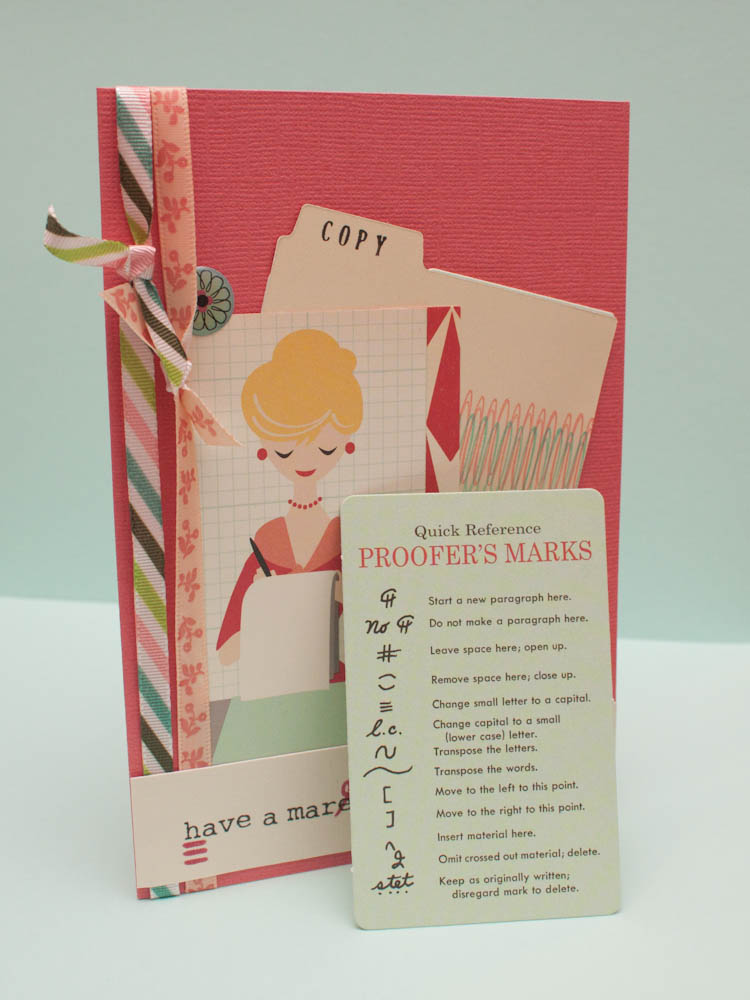 I made this birthday card for a friend and fellow copy editor, and it features the “proofer’s marks” die-cut card from the 9 to 5 “Miscellany” pack. The marks still are used in the profession today, and I thought the die-cut would be a nice keepsake.
