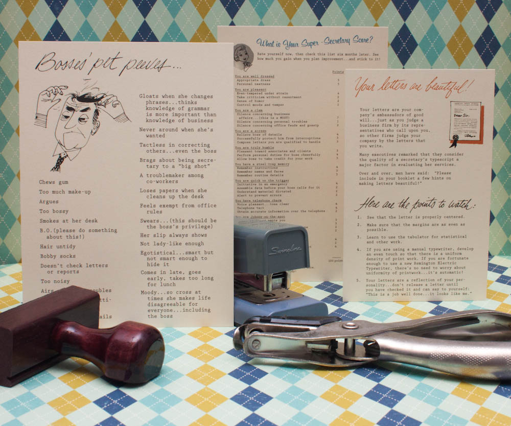 The line, with a vintage theme, has items that feature typewriter-ribbon labels, office ephemera and guides that may have been found on a secretary’s desk decades ago, such as excerpts from 1949’s “How to be a Super-Secretary” pamphlet (to see a PDF of the pamphlet, go here).