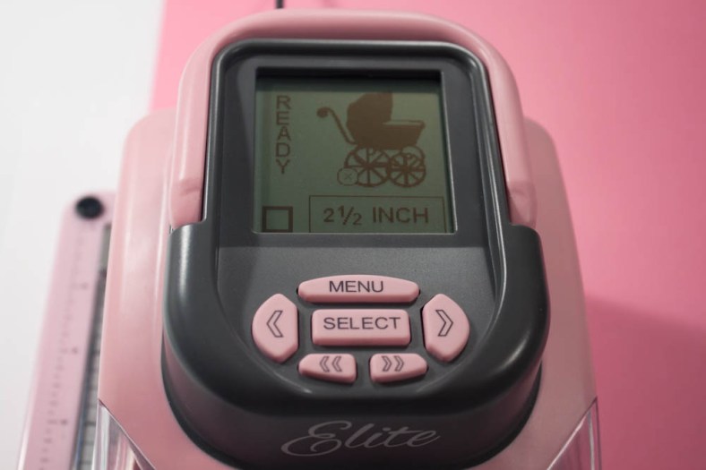Cut a 2 1/2-inch baby carriage die-cut (I used my Slice and the “Grandma’s Attic” design card) in pink textured cardstock (I used one from the Street Lace collection).