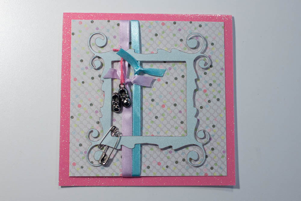My husband and I are friends with a couple expecting a baby girl. I turned to my trusty Slice, pink glitter cardstock, tiny shoes and safety pins for this card.