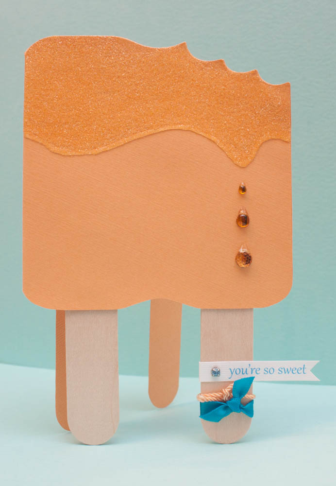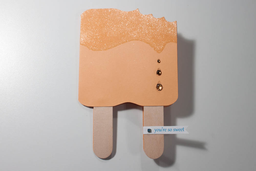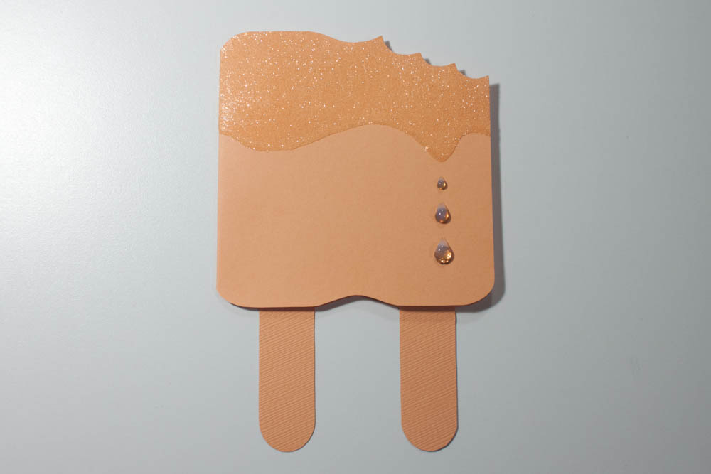 Cut out the card piece and fold it in half. Apply glue (such as Aleene’s Jewel-It) at the top of the card, in a shape that gives the ice pop the appearance of “melting.”