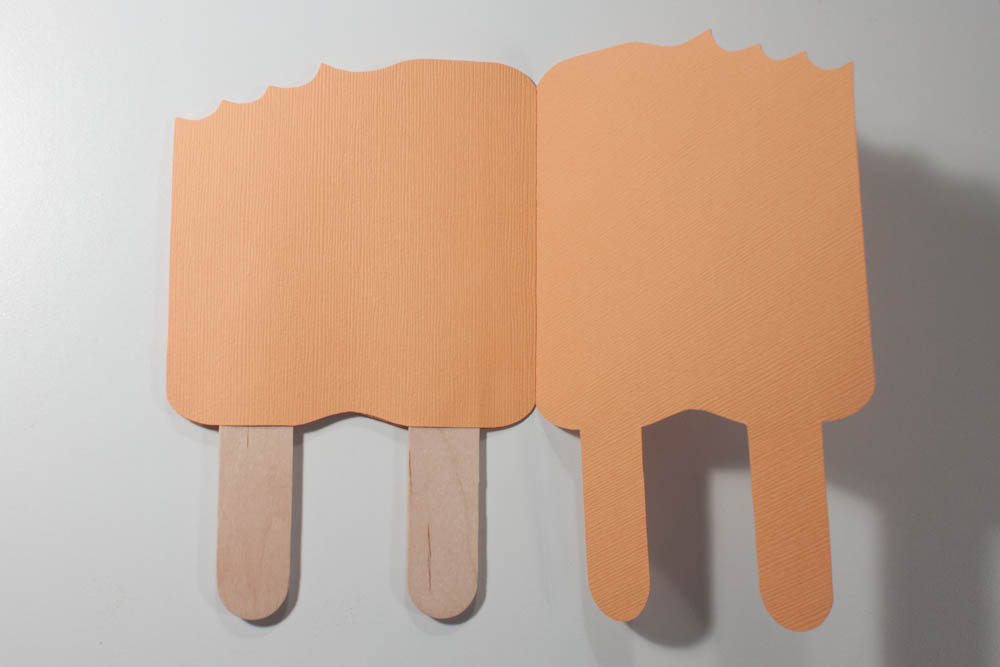 Trim two jumbo craft sticks to 3 3/4 inches. Adhere to the back of the card front, lining them up with the stick shapes on the other half of the card. Cut out the card front’s backing, apply adhesive and turn it over to attach to the card, lining up the outer edges (the backing is shorter for the edge on the fold, so that the card folds properly) .