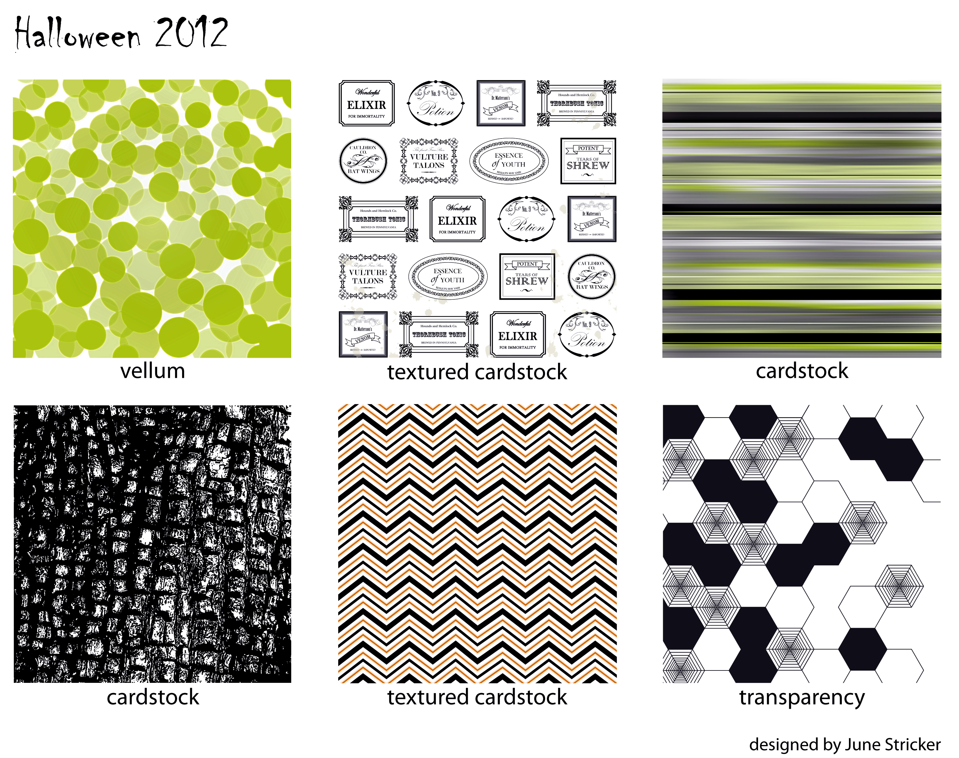 Since I designed patterned papers to use on my Valentine’s Day cards, I’ve been wanting to create another set. Halloween is one of my favorite holidays, so I designed papers that show some of the latest trends in paper crafts: