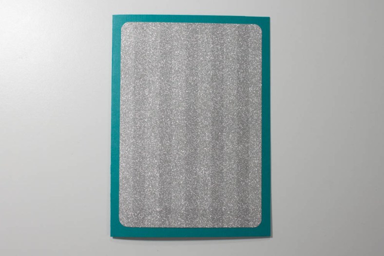Make a card from a 9-by-6 1/4-inch piece of teal textured cardstock. Cut a 4-by-5 3/4-inch piece of striped silver-glitter cardstock (such as Pow! glitter paper by American Crafts). Using a corner rounder, round all corners and adhere, centered, to the card’s front.