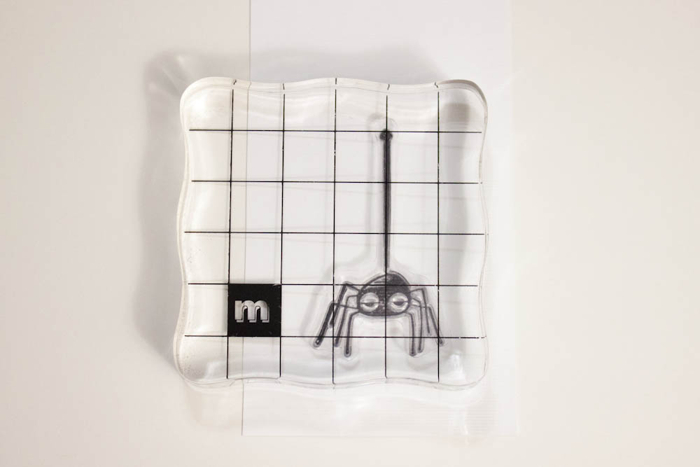 Stamp a spider image (such as one from the Fun Spiders collection by Inkadinkadoo) in black ink (I used Versafine in onyx black) onto white cardstock.