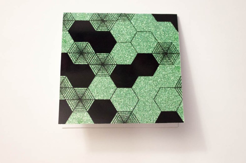 Draw an outline around the spider in pencil and cut out the shape using detail scissors. Draw an outline around the cutout on light-green metallic textured cardstock (mine is from Bazzill Basics) and cut it out. Adhere the white cutout, centered, onto the green cutout, and erase any visible pencil lines.