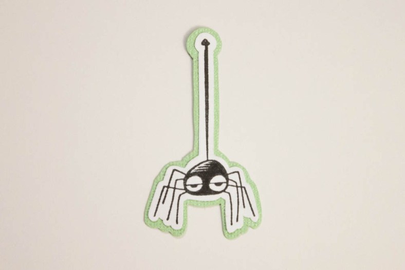 Adhere the “eek” piece to the card’s left edge, about 3/4 of an inch from the bottom. Adhere the spider cutout above the right end of this piece. Affix a black rhinestone (mine’s from Michaels) to the “knot” of the spider’s thread.