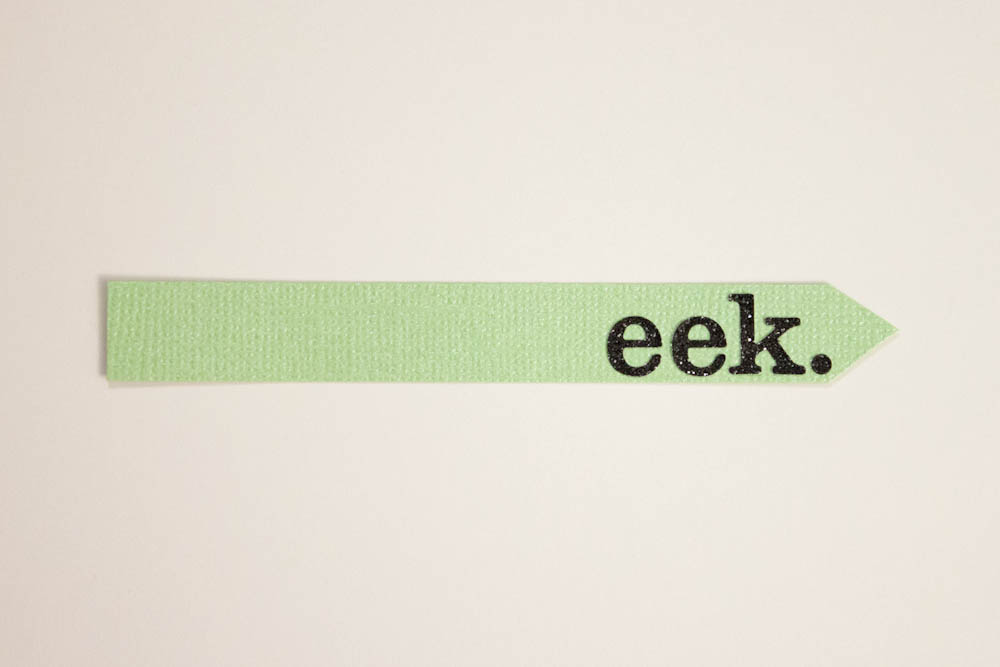 Cut a 4-by-1/2-inch piece of the metallic textured cardstock. Trim the right end to a point. Adhere lower-case, black glitter letter stickers (I used Making Memories Scrapbook Basics Black & White Shimmer Alpha stickers) to spell “eek.” on the right end of this piece.