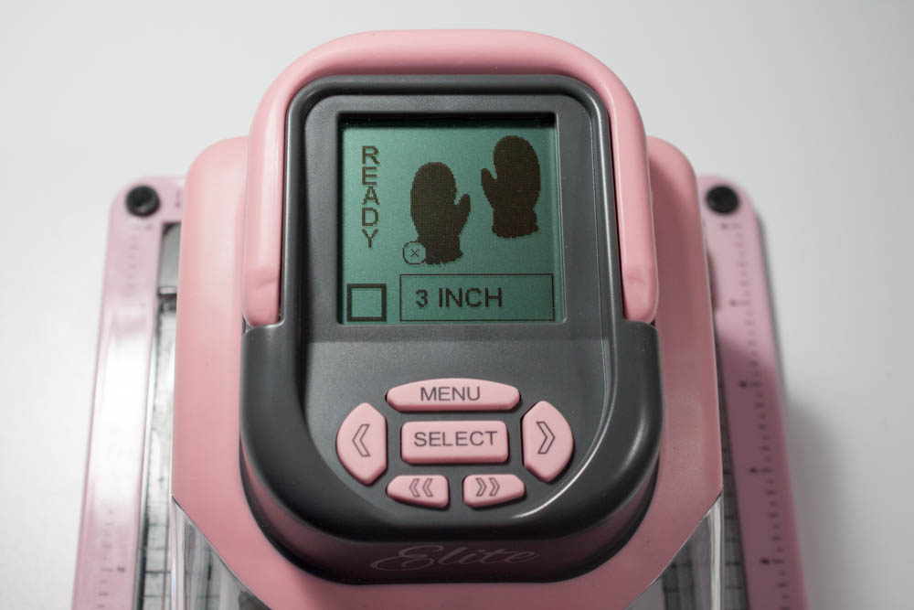 First, I cut out 3-inch-high mittens from a 4-inch-square piece of scrap cardstock, using my Making Memories Slice Elite and “Mistletoe” design card.