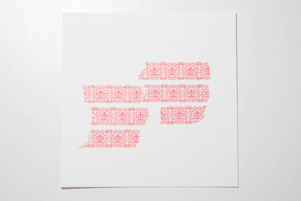 Adhere six pieces of red-and-white patterned washi tape (such as from the decorative washi tape set No. 2 by Hambly Studios) horizontally to the white cardstock, using the pencil lines as guides (three pieces per mitten). Keep the tape below where the mittens’ cuffs will be, and add some space between each piece. Erase the pencil lines.