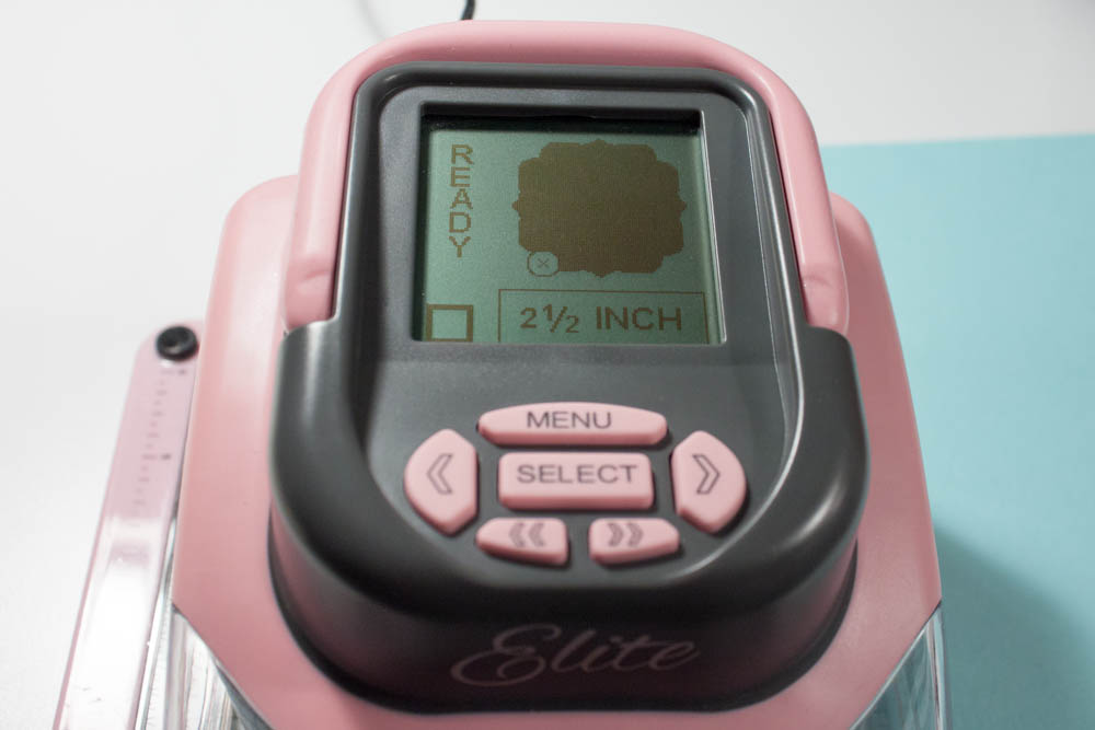 I used my Making Memories Slice Elite, “Paper Reverie” design card and aqua textured cardstock to create a 2 1/2-inch die-cut of a square with a decorative edge.