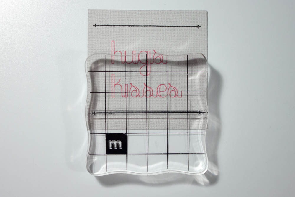 Using a computer program, type “hugs” on one line and “kisses” on a second line in fuchsia in a decorative font (I used Peach Sundress, 48 pt., available here). Adjust the leading to decrease the space between the words, if necessary, and print onto textured, light-gray cardstock (such as Coredinations canvas texture in mystic gray). Trim the cardstock around the text to 3 inches square, making sure the text is centered in the square.