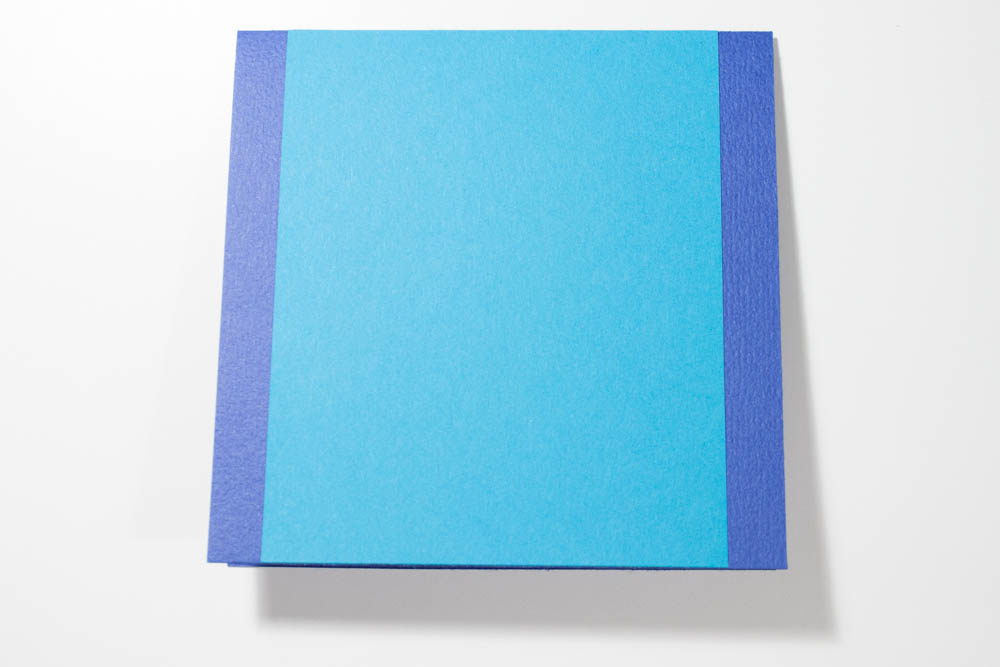 Make a card from a 5-by-10-inch piece of textured blue cardstock. Cut a 4-by-5-inch piece of aqua cardstock and adhere it, centered, to the card’s front.