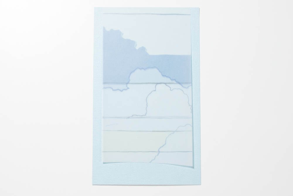 Cut a 3-by-5-inch piece of light-aqua textured cardstock. Cut a 2 1/2-by-4 1/2-inch section of cloud-patterned vellum (I used “Breakaway” from the En Route collection by SEI, with the bottom edge cut along a sloped line in the pattern) and adhere it, centered, to the light-aqua piece (I applied Therm O Web vellum adhesive to the top corners, then later determined the bottom corners needed adhesive as well).