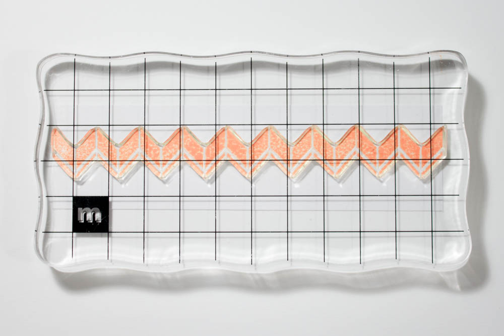 Stamp a chevron image (I used a stamp from the Chevrons Two Step collection by Technique Tuesday) in neon-orange ink (Hero Arts) onto white cardstock.