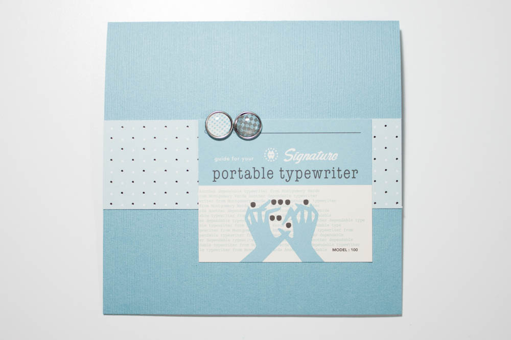 Attach two light-blue, checkered brads (such as from the On the Edge collection by Teresa Collins) to the upper-left corner of a piece of cardstock that features typing images and phrases in light blue (mine’s from the 9 to 5 collection’s “Miscellany” pack by October Afternoon). Adhere the cardstock half an inch from the card’s right edge, lining up the top edge of the piece with the top edge of the polka dot cardstock.
