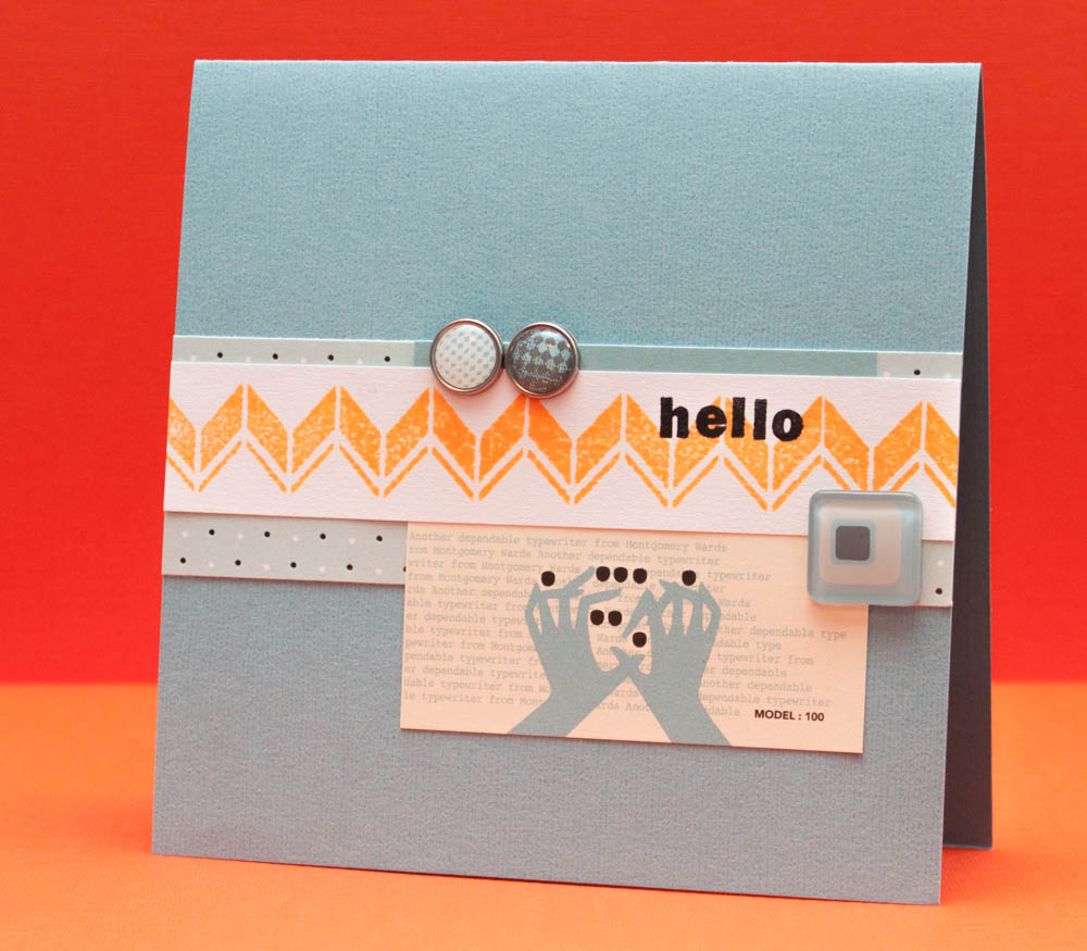 The unevenly inked chevron line breaks up the balanced appearance of the card and softens the boldness of the neon-orange ink. I wanted the zigzag to be the focal point, so I kept the rest of the elements all close to the same light-blue tone.