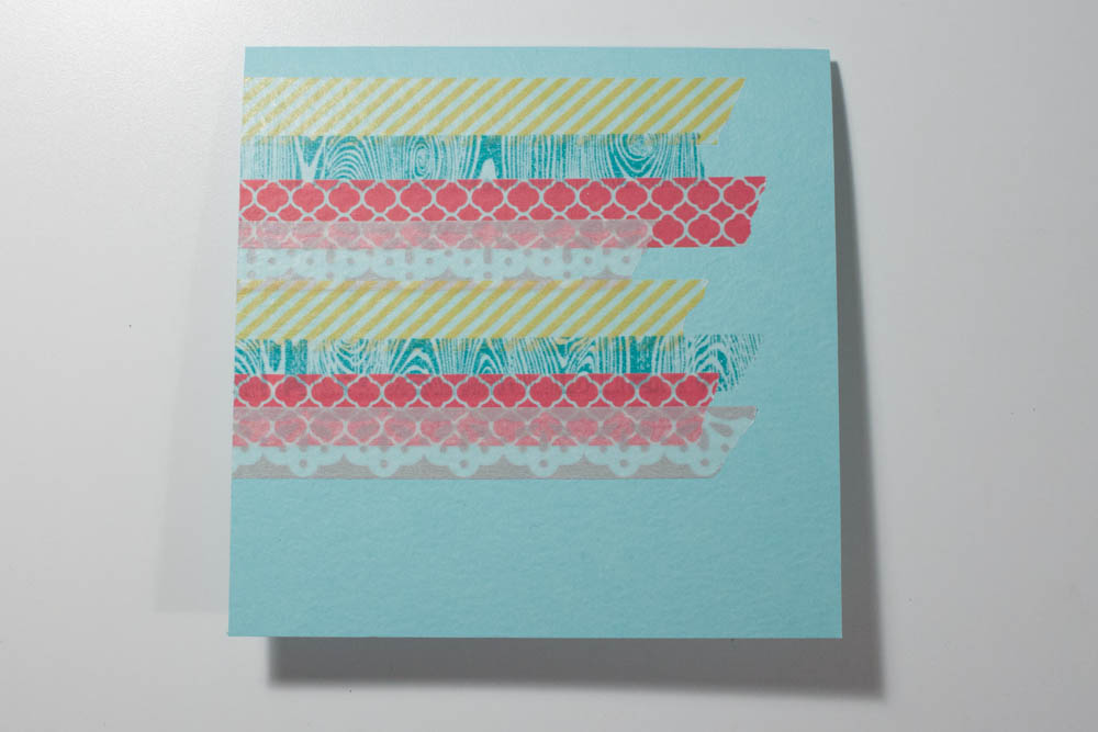 Make a card from a 5-by-10-inch piece of textured light-aqua cardstock. Adhere several strips of washi tape in different patterns in teal, citrine, gray and hot pink (I used Hambly Studios Screen Prints blue woodgrain from set No. 2, gray and citrine tapes from Bluebell “Smile” from The Sweetest Thing collection by Jen Allyson for My Mind’s Eye and a hot-pink, trellis-patterned tape) in different lengths, each one slightly overlapping, horizontally to the card’s front. Start each piece on the card’s left side; trim any excess tape from the edge.