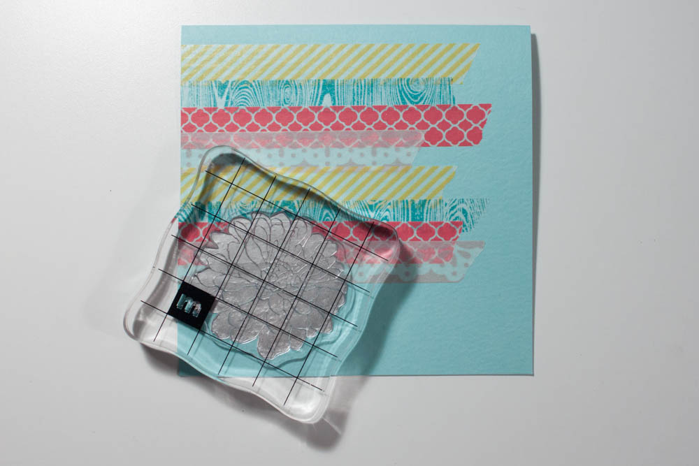 Stamp a flower image (such as one by Angela Nickeas for Pink Light Design for Studio G by Hampton Art) in multi-surface silver ink (I used Brilliance ink in starlite silver) in the lower-left portion of the card, partially over the tape.