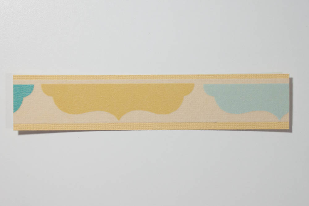Cut a 5-by-1-inch piece of citrine textured cardstock (such as Coredinations canvas texture cardstock in high noon). Adhere a blue-and-citrine patterned washi tape (Bluebell “Smile”) across this piece and trim any excess from the edges.
