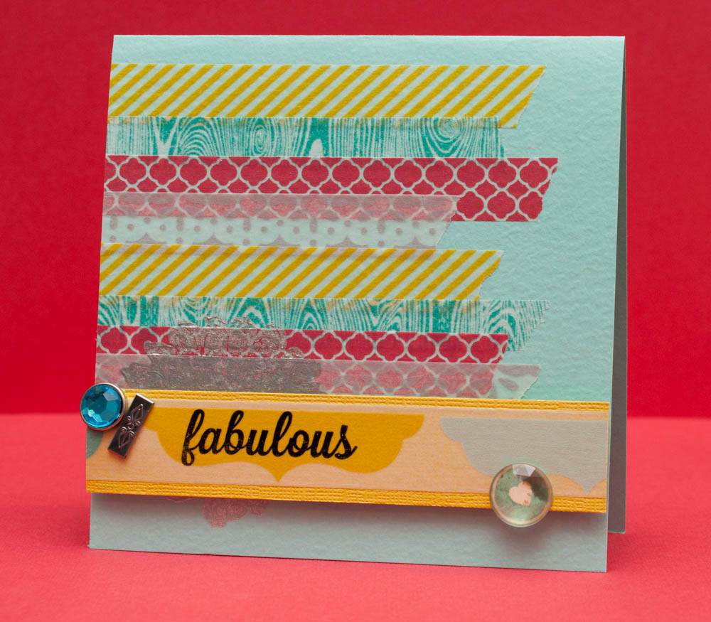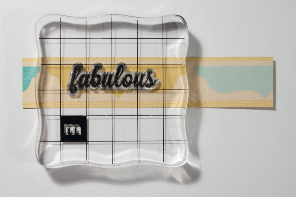 Stamp “fabulous” (mine’s from the Portfolio collection by Pink Paislee) in multi-surface black ink (I used StazOn in jet black) over the tape, closer to the left end.