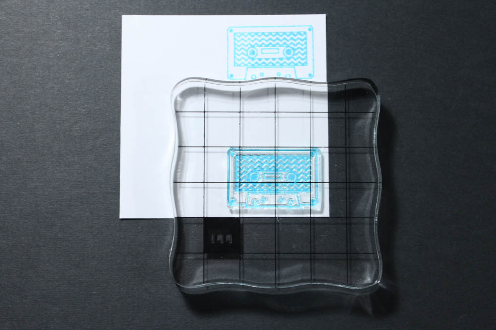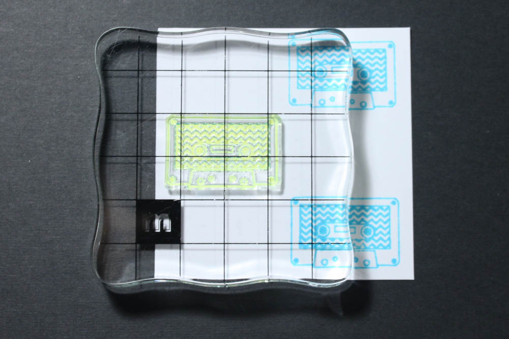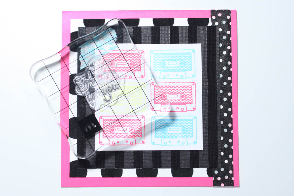 Stamp “you” (I used part of a stamp from the Celebration Expressions collection by Inkadinkado) in black ink (such as Versafine in onyx black) diagonally over the neon-yellow cassette.