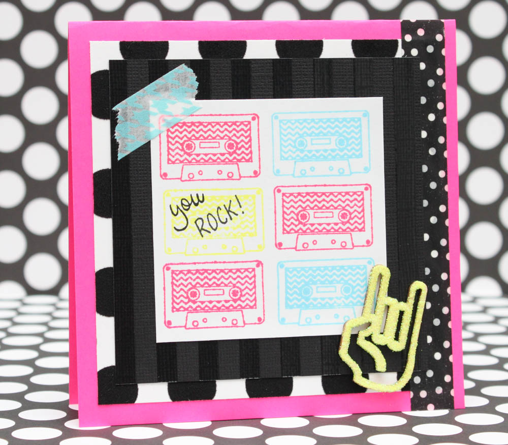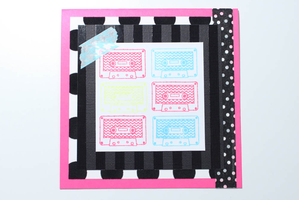 This card is all retro: I combined my bright neons with a stamped image of a (not-so-old) relic: the cassette. I get nostalgic looking at this stamp, but I’ll take digital music files over analog versions any day, thank you very much.