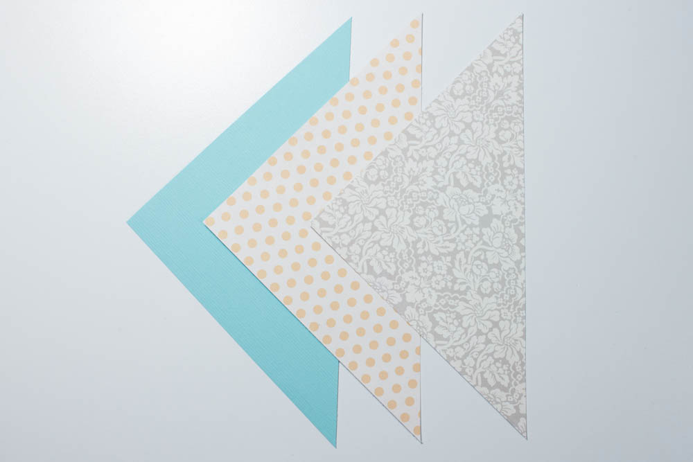Make a card from a 5-by-10-inch piece of textured, light blue-green cardstock. Cut gray-and-off white, floral-patterned cardstock; citrine polka dot cardstock (both are from the Park Bench collection by Fancy Pants Designs) and light-teal, textured cardstock to 5 inches square. Cut each square diagonally through the center. Only one triangle from each square will be used.