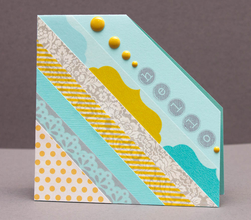 Adhere gray-and-white patterned washi tape (“Bluebell Smile”) diagonally over the light-teal piece, about half an inch from the diagonal edge and over the card’s left and bottom edges. Trim the excess. Trim 2 inches from the polka dot piece’s diagonal edge, and adhere it to the lower-left corner of the card’s front.