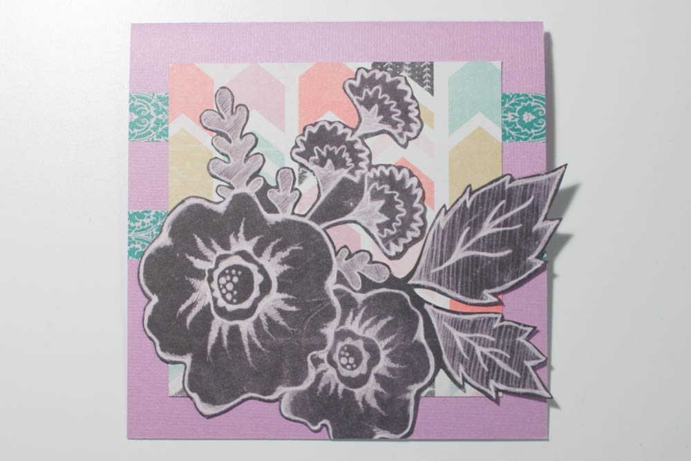 Cut out a chalkboard-inspired floral image from patterned cardstock (mine’s from “Blackboard” from the Chalkboard collection), leaving a small margin around the image. Adhere it to the card’s front.
