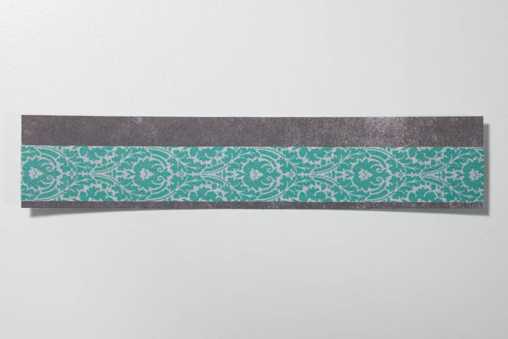 Make a card from a 5-by-10-inch piece of lilac textured cardstock. Affix two strips of teal, damask-patterned washi tape horizontally across the card’s front, with the first strip placed about 3/4 of an inch from the top and the second evenly spaced below the first. Trim the excess from the edges.