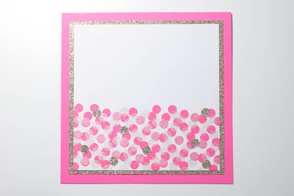 Cut a piece of gold glitter cardstock that’s slightly larger than the neon-pink piece and adhere the pink piece, centered, over it. Using dimensional adhesive, adhere the gold piece over the dots, off-center.