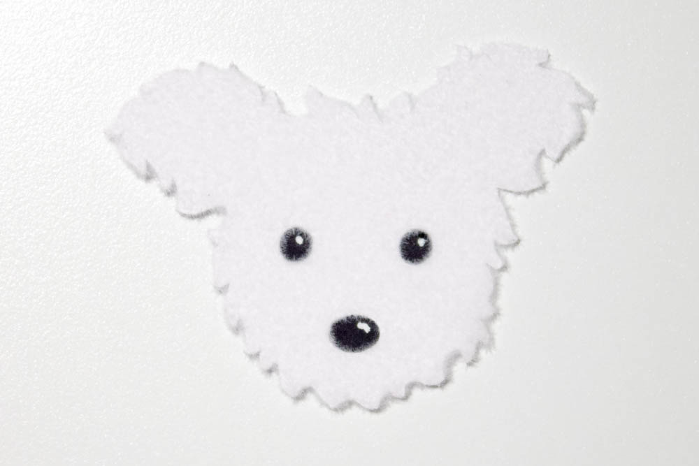 Adhere a small piece of black cardstock behind the puppy’s head for its eyes and nose, if needed, and add highlights with white gel pen (such as Sakura Gelly Roll in white).