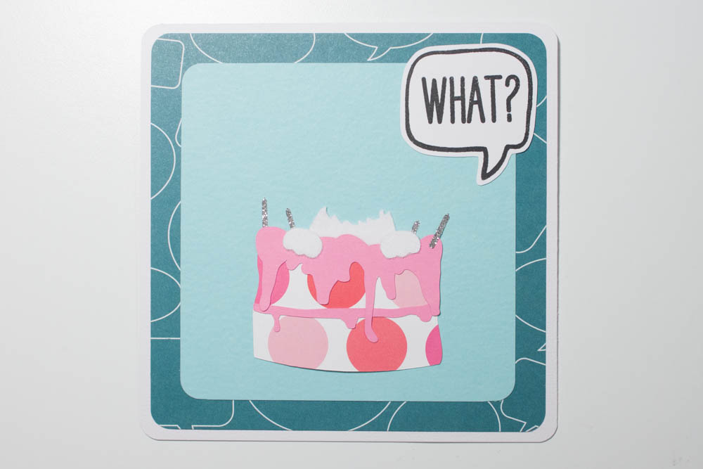 Stamp “WHAT?” in a talk-bubble image (mine’s from the Nailed It collection designed by Shimelle Laine for Two Peas in a Bucket and Hero Arts) in black ink (I used Versafine in onyx black) onto a piece of white cardstock.