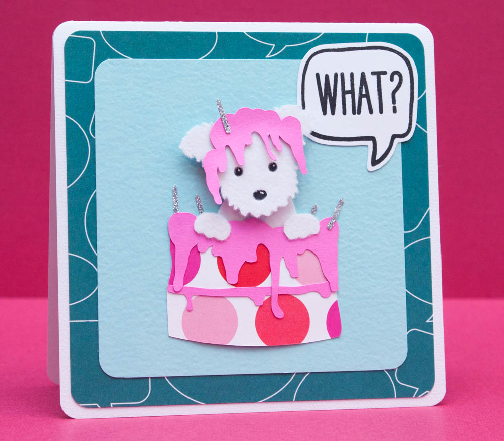 Adhere the puppy’s body, the cake die-cut and its die-cut frosting, some of the die-cut candles and the puppy’s paws to the lower portion of the light-teal piece, centered.