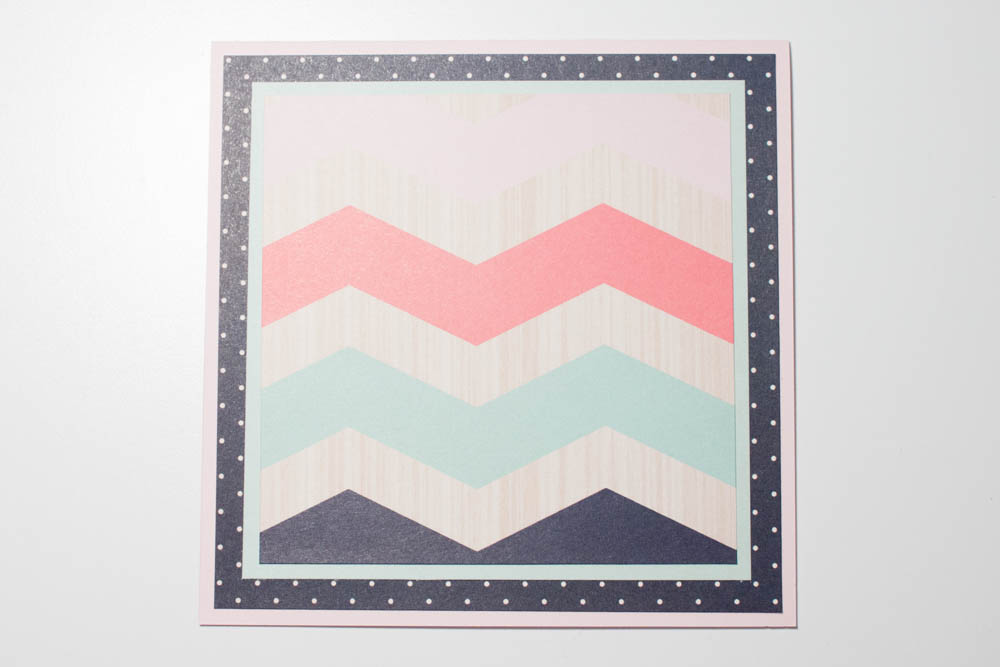 Cut a 4-inch-square piece of multicolored, chevron-patterned cardstock (“Posh” from Trend Setter) and adhere it, centered, to the green piece.