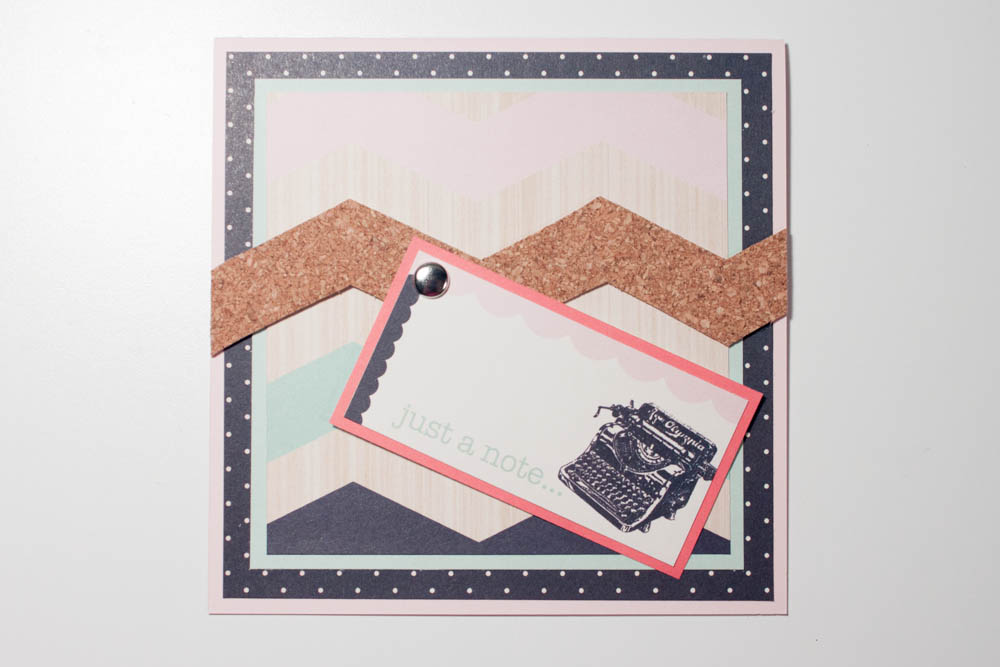 Cut out the tracing from the cork. Affix a tag that says “just a note” (I created mine using part of “Strips” and the reverse side of “Haute” from Trend Setter) onto the cork strip using a silver-colored brad.