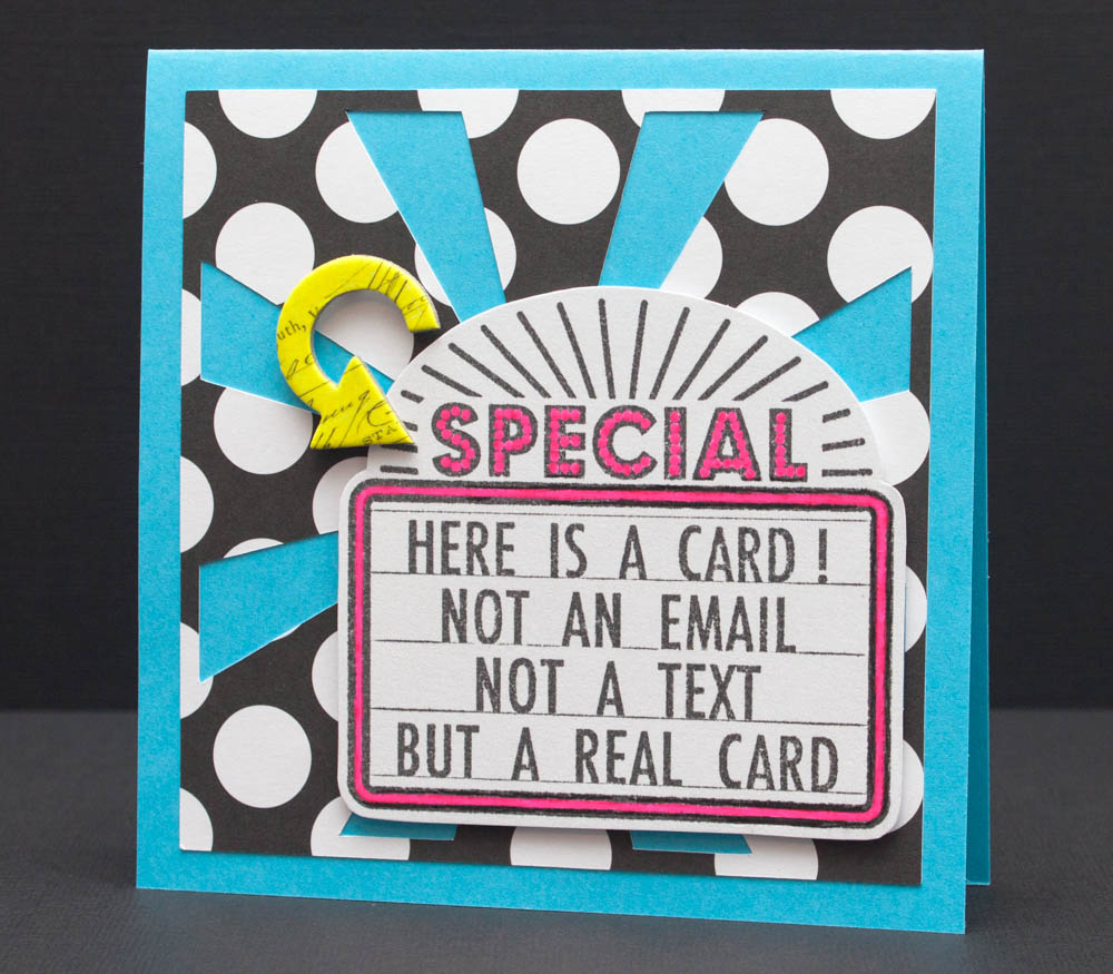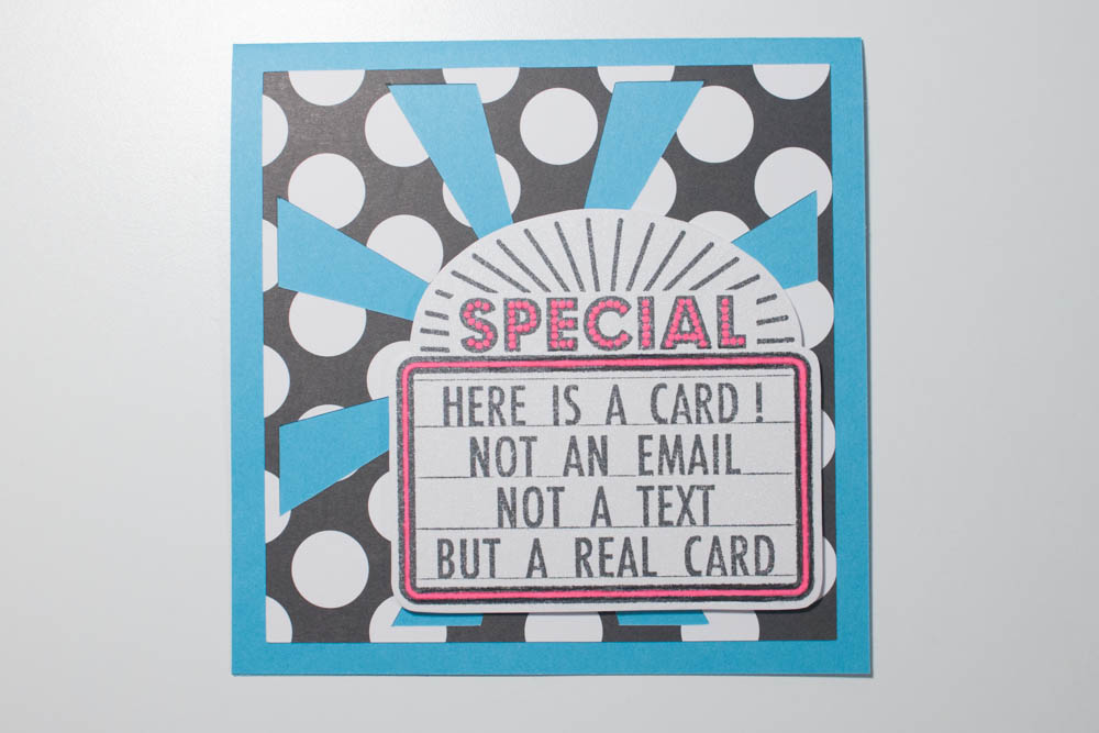 And what better way to emphasize it than with neon colors and big polka dots in a sunburst design? Special, indeed. I’ve created a sunburst design on a card before, simply by cutting out triangles and adhering them to the card. For this card, I designed a die-cut sunburst using my Silhouette Portrait (my design is available to download here).